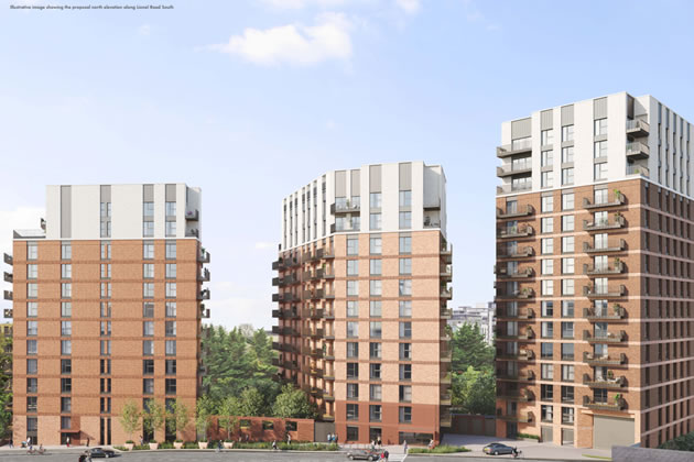 November 7, 2025 A fresh set of plans has been submitted for the redevelopment of the so-called Duffy site beside Brentford’s Gtech Community Stadium, marking what would be the final major residential phase of the wider Stadium Masterplan. The proposals, brought forward by Kew Bridge Gate Developments LLP (EcoWorld London), would deliver 294 flats, including 58 affordable units, across four new residential blocks on Lionel Road South. The Duffy phase forms part of the same scheme that enabled Brentford Football Club to relocate from Griffin Park in 2020. Earlier phases including 740 flats at Central Eastern, Central Southern, and Capital Court have already been completed and are now occupied. The proposed scheme would replace earlier plans approved under the original outline consent, which envisaged 275 flats on the site. The new design increases by 19, and also raises the overall housing number across the wider Masterplan from 910 to 1,034. The applicant says the increase reflects borough-wide housing need and updated design standards. The additional affordable homes would be delivered within Block C2, one of the two blocks located closest to Lionel Road South. To achieve better daylight and reduce the number of single-aspect north-facing flats, the large, single block originally planned for the northern edge has been split into two buildings (C1 and C2) and re-oriented.