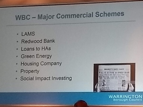 This slide from Warrington is an example of the leading edge (we used to call it the bleeding edge in the IT industry) where they have started a bank to support small business, made loans to Housing Associations, built some wind farms and started Lampton 360 Development and Investment style subsidiaries. Don’t ask me what LAMS means because I’ve forgotten (can’t have been very interesting) [Local Authority Mortgage Scheme, Ed]. Food for thought, and they are a proper Labour council driven by a desire to fill needs that the market doesn’t address satisfactorily as well as generate surpluses to feed back into protection of services.