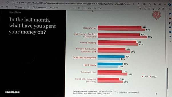 Wednesday morning I had my quarterly formal contract review meeting with Hounslow Highways. As usual, there are some good things and some less good going on and we have a full and frank exchange of thoughts. I am reasonably hopeful because they take our concerns seriously and we are I think getting better at making our demands. It’s not easy to administer a PFI deal negotiated largely by persons unknown more than a decade ago but there is a will to make it all work. In the evening we had a formal meeting between the cabinet and the top officers of the council, the latest of a series when we look at the financial challenges we have next year and in the subsequent years. As our income is at best flat, against an enormous level of inflation (the fact it has come down a bit is a long way from fixing any problems) an increase in population and a population that is getting older and less able to look after itself, the challenge is extreme. We will find a way, but there will be big bumps on the road. We are inching towards getting the best plan we can achieve, which we need to conclude in a couple of months’ time. This morning, a bike ride up to Chiswick to see my GP about various issues mainly around my dodgy shoulder and it was a surprise to be accosted there by someone who I know well from Brentford, off patch like me. Turns out he lived in Devonshire Road when he was a nipper and we reminisced about the first doctor I had in Chiswick, now long retired. I reminisced about his advice about my daughter when she was a toddler and couldn’t settle down when we travelled. He prescribed a bit of gin in her bottle as a remedy, not advice that we found terribly helpful. After a lunch out with my sister, I returned to join a call with the polling company, Savanta. They had invited me and I think many others to observe a call they had with some young people – about 18 to 25 – who were talking about how the economy was impacting their life. They were all courageous but it brings back to me how difficult it is to be a young adult in the world as it is today. Two charts caught my eye – one which showed how they manage money. Striking how they have saved greatly in most categories other than what is mainly Netflix. It costs, but it costs a lot less than going out.
